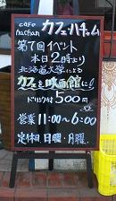 去る21日、発寒商店街に新たな風を吹きこむべく、桑原真希氏率いるわれら北大映画館プロジェクト3名(桑原、安藤、寺尾)が乗りこんで行きました。会場となったカフェハチャムはJR発寒中央駅から徒歩10分ほど、発寒商店街の道路沿いのややJR寄りです。